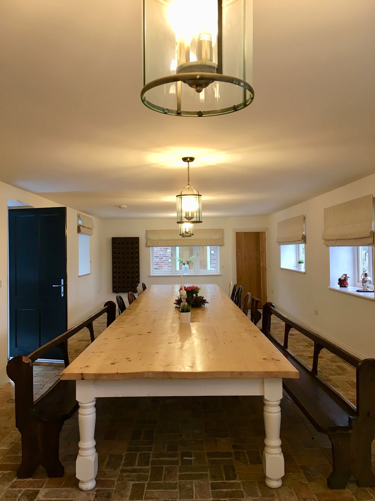 There is a large modern kitchen complete with original flagstone floors, which opens out into a beautiful large dining hall with original brick flooring and a wishing well! The dining area is mainly taken up by one HUGE refectory table with a stunning top honed from a single piece of wood (once again made by Candice’s clever husband Phil) and flanked on either side by painted church pews and farmhouse chairs…
