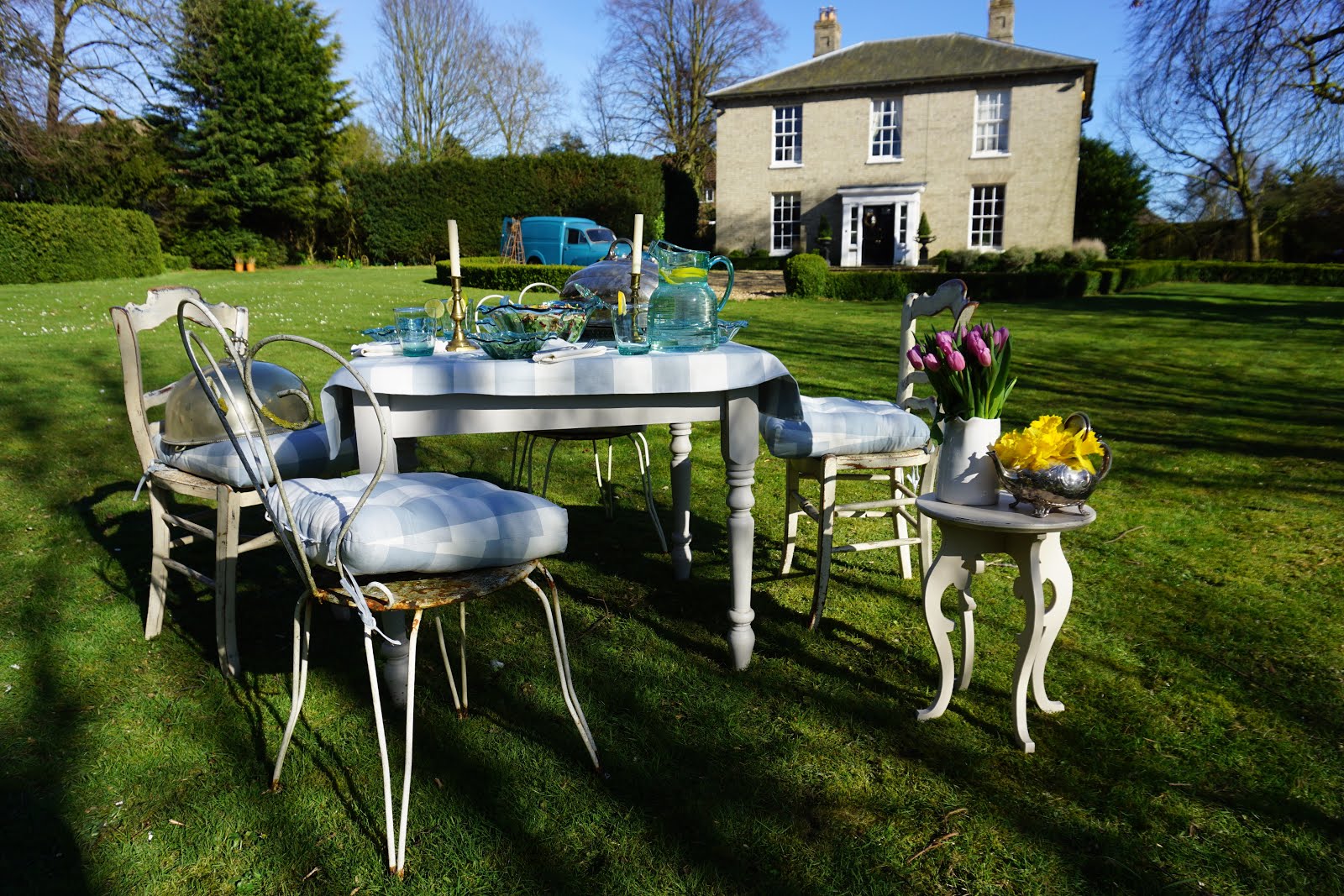 table and mismatched vintage chairs the whole scene looked fabulous against the crispness of