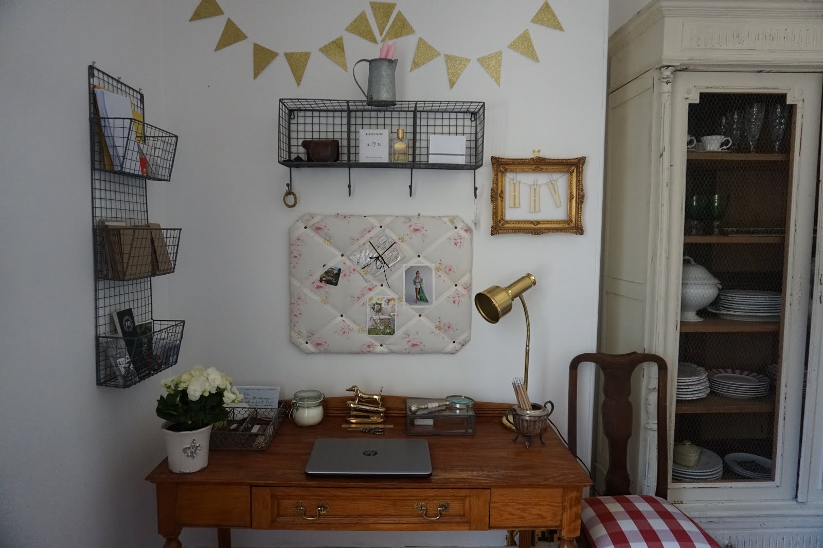 I had already found the desk on eBay a couple of years ago, and although I am known for painting much of my furniture, I felt that this particular area shouldn’t be too girly or ‘feminine’, but should maintain an air of utility, functionality and efficiency about it. This of course didn’t mean compromising on making it a stylish or attractive corner, but as the rooms main use is as a dining room, with a huge centrally located chandelier, fabulously French vintage armoire, and a white painted ornate sideboard that resembles an iced wedding cake, the style of this study corner could afford to be more pared down, with a few carefully chosen accessories to add sparkle and bling if necessary.