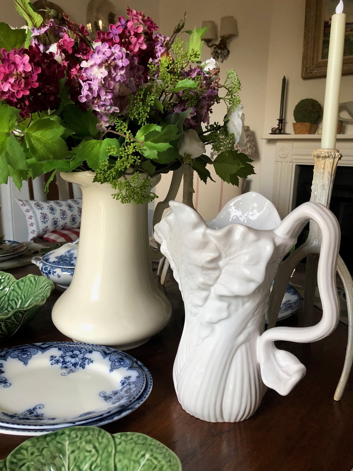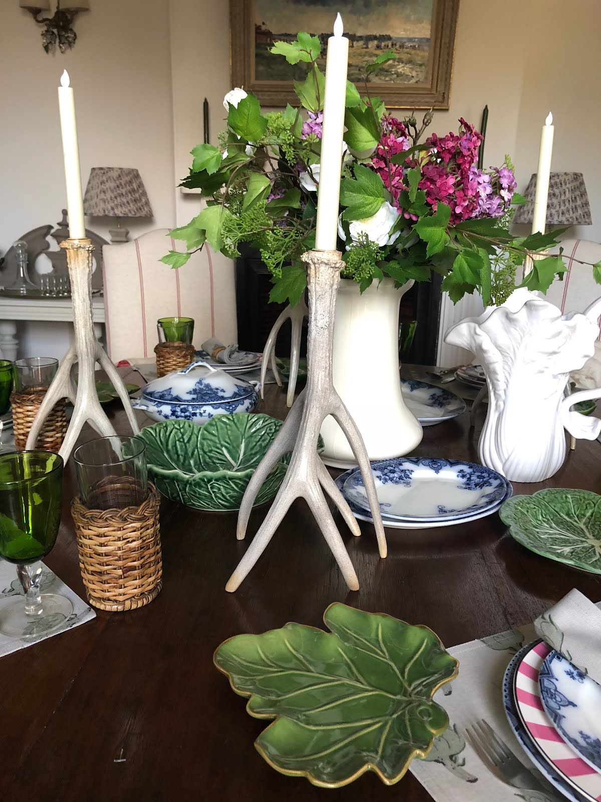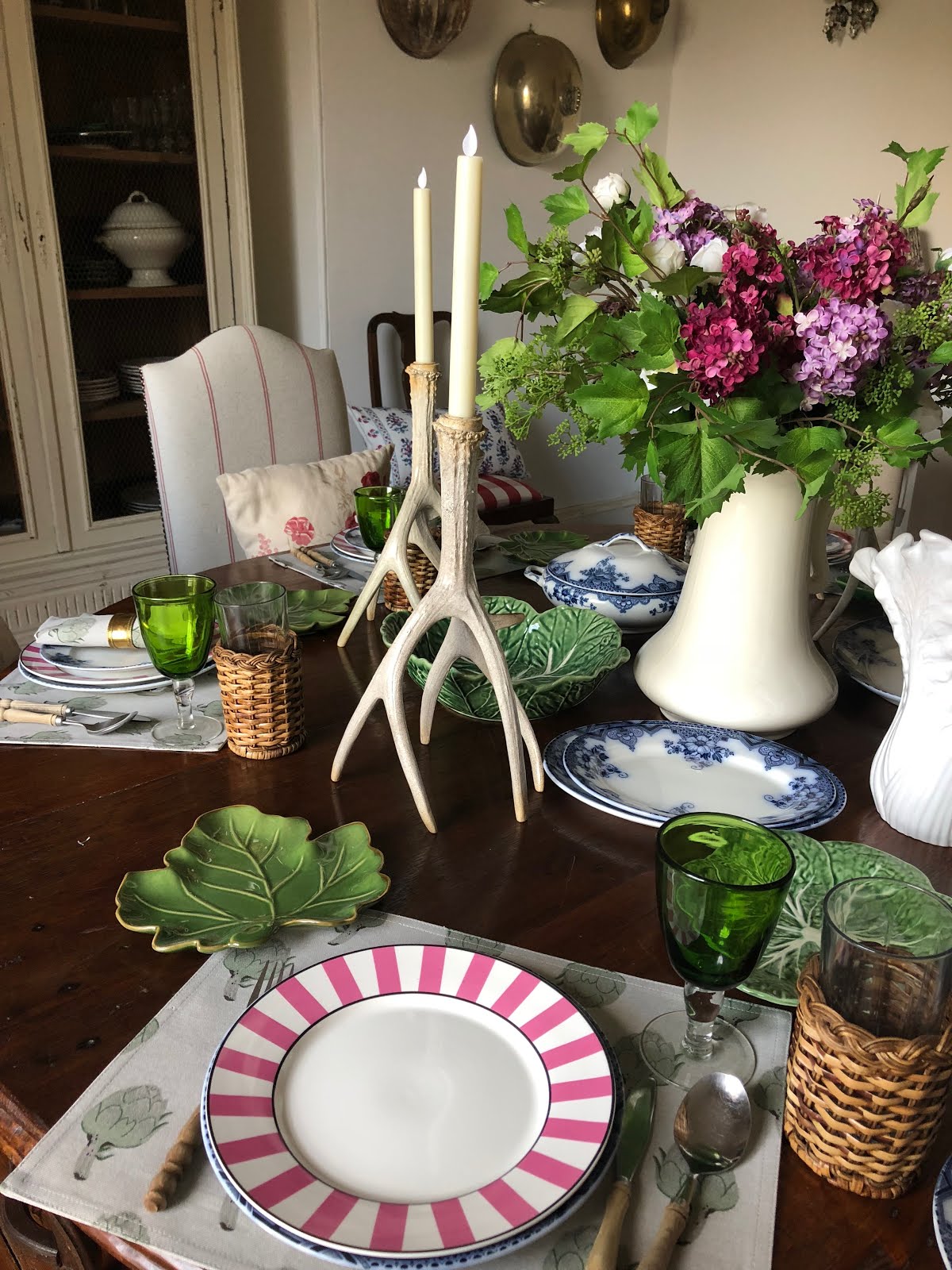 The crockery is a mix of my favourite vintage cabbage ware, some new OKA green leaf side plates (I also have the equally luscious and much larger dinner plates), my recently purchased 1940’s vintage Flow Blue china and some elegantly pretty pink striped OKA dinner plates that I bought last year in the sale…