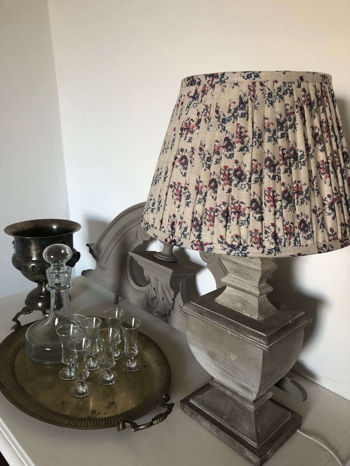 …As can be seen here with another warm and Autumnal addition – these stunning pleated linen lamp shades and matching scatter cushion are in OKA’s Sototaprint. The blue and rouge tones against a neutral background add a pared back yet exotic bit of colour to the otherwise pale background, and provide a lovely contrast to my red check Ian Mankin fabric on a side chair. See below.